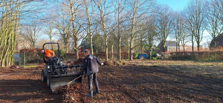 We zijn van start! De grote hoeveelheid bramenstruiken is al afgevoerd. Binnekort komt er een vrachtwagen zwarte grond bij en kan het graszaad eroverheen. De lantarens komen later. We houden jullie op de hoogte!